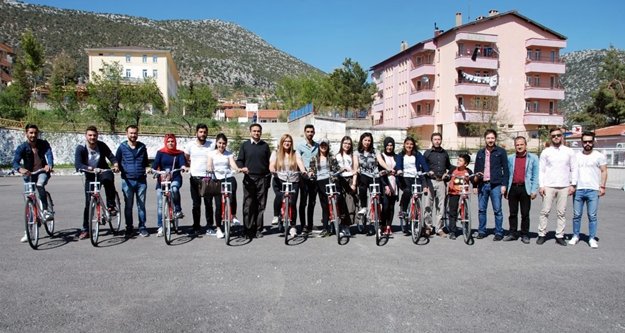 Bisikletlerin teslim edilmesinin ardından Akseki Meslek Yüksekokulu öğrencileri bahçede bisiklet dolandılar.