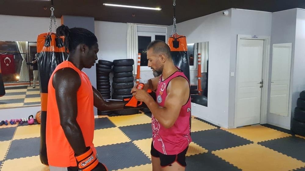 Antrenmanın başında ısınma hareketleri yapan Sakala, sonrasında ise adeta bir Muay Thai sporcusu gibi kum torbasına tekme ve yumruk attı.