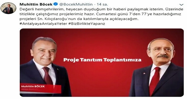 CHP Genel Başkanı Kemal Kılıçdaroğlu, Konyaaltı Belediye Başkanı ve Millet İttifakı'nın Antalya Büyükşehir Belediye Başkan adayı Muhittin Böcek’in 23 Şubat Cumartesi günü yapacağı proje lansmanına katılacak. Böcek, seçimi kazanması halinde Antalya'ya yapacağı projelerin tanıtım toplantısına Kılıçdaroğlu'nun da geleceğini twitter hesabından duyurdu.