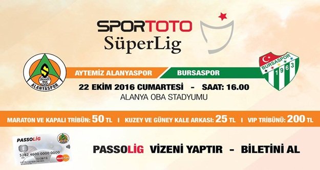 Spor Toto Süper Lig’in 8.haftasında Bursaspor ile Oba Stadyumun’da oynayacağımız karşılaşmanın biletleri satışa sunuldu.