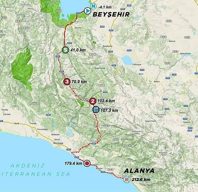 TUR 2021' in 3. etabı 13 Nisan Salı günü (bugün) Beyşehir'de başlayacak ve Alanya Atatürk Anıtı önünde tamamlanacak. 4. etap 14 Nisan Çarşamba günü saat 10.20 de İskele Şelale önünden start alacak.