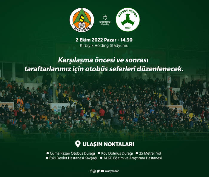Halk otobüsleri saat 13.30'dan itibaren her 20 dakikada bir Cuma Pazarı’ndaki otobüs durağından kalkarak Köy Dolmuş Durağı’ndan geçip, sırasıyla 25 Metrelik Yol üzerinden eski hastane kavşağı ve Alanya Alaaddin Keykubat Üniversitesi Eğitim ve Araştırma Hastanesi güzergahından Kırbıyık Holding Stadyumu'na gidecek.