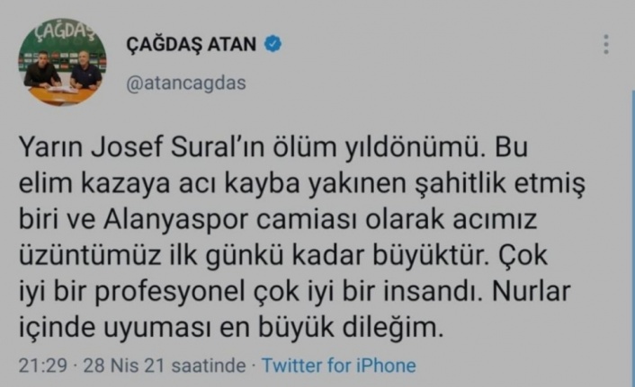 Aytemiz Alanyaspor Teknik Direktörü Çağdaş Atan, sosyal medya hesabından yaptığı paylaşımda, “Yarın Josef Sural'ın ölüm yıl dönümü (29 Nisan 2019). Bu elim kazaya, acı kayba yakınen şahitlik etmiş biri ve Alanyaspor camiası olarak acımız, üzüntümüz ilk günkü kadar büyüktür. Çok iyi bir profesyonel, çok iyi bir insandı. Nurlar içinde uyuması en büyük dileğim” dedi.