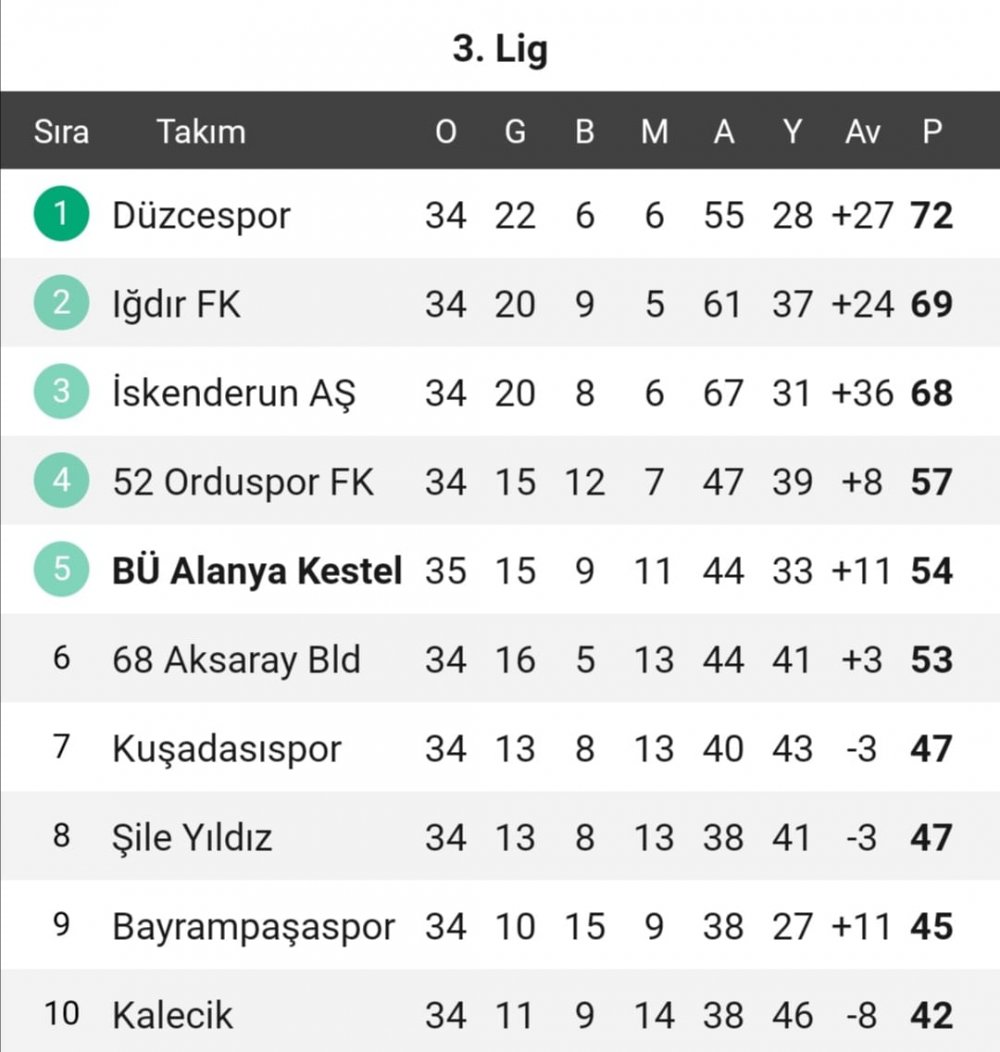 Ligde 8 maçtır yenilmeyen ve üst üste 4. galibiyetini elde eden Alanya Kestelspor, puanını 54'e yükseltti ve ligde beşinci sıraya yerleşti. Kızılcabölükspor ise 34 puanda kaldı. Alanya Kestelspor ligin son maçında Siirt İÖİ ile Alanya'da karşı karşıya gelecek ve play-off şansı arayacak.