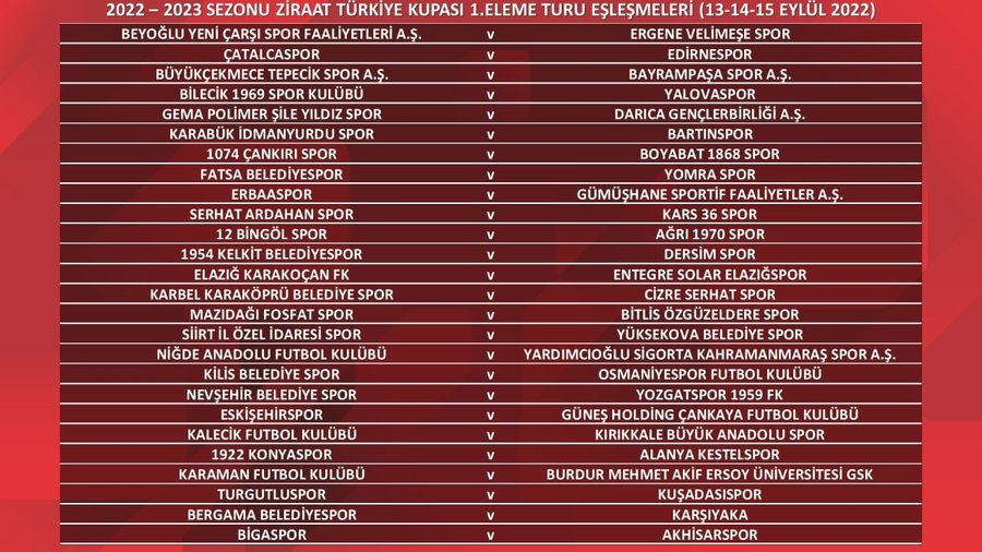 Ziraat Türkiye Kupası 1. Eleme Turu eşleşmeleri bugün TFF Riva Hasan Doğan Milli Takımlar Kamp ve Eğitim Tesisleri'nde yapılan kura çekimi ile belirlendi.
