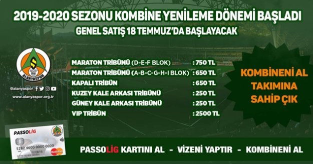 Kombine alımı esnasında Passolig yıllık kart kullanım süresinin en az 31 Mayıs 2020 tarihine kadar geçerli olması gerekmektedir. Kombineler, www.passo.com.tr veya Alanyaspor Passolig Ofisi’nden taksit avantajıyla yenilenebilir. Taksitli kombine yenilemelerinde yüzde 8 vade farkı uygulanmaktadır. Kombine yenileme için www.passo.com.tr adresinden üye girişi yaparak 'kombine rezervasyonlarım' bölümünden bir önceki sezona ait kombinesini aynı koltuk numarasıyla yenileyebilecek.