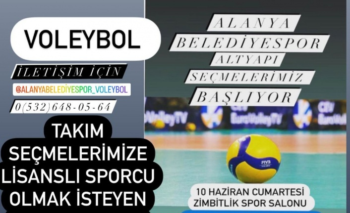 Alanya Belediyespor yarın (10 Haziran 2023 Cumartesi) Zimbitlik Spor Salonu'nda voleybol altyapı seçmelerini gerçekleştirecek.