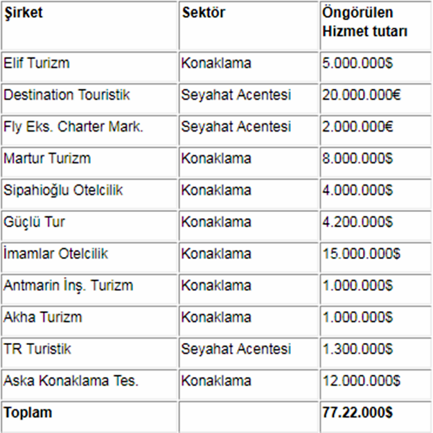 Temmuz ayında vergi, resim ve harç istisnası getirilen turizm şirketleri ile bu şirketler için öngörülen hizmet tutarları şöyle: