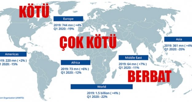 BM Dünya Turizm Örgütü, koronavirüs salgınıyla boğuşan dünyada turizmin yaşayacağı kayıba ilişkin 3 senaryo hazırladı. Covid-19’un etkisine odaklanarak hazırlanan raporda, küresel seyahat endüstrisinin 2020’nin ilk çeyreğinde yüzde 22, sadece mart ayında ise yüzde 57 daraldığı belirtildi. Bunun 67 milyon yolcu azalması ve 80 milyar dolarlık kayıp anlamına geldiği belirtilen raporda, yıl genelinde seyahat pazarının küresek ölçekte yüzde 58 ile yüzde 78 arasında daralacağı öngörüldü.
