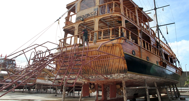 Her yıl binlerce turisti taşıyarak ilçenin tarihi güzelliklerini eğlenceli bir şekilde görme imkanı sağlayan günü birlik tur tekneleri bakım için karaya çıkartıldı. Karaya çıkartılan teknelerin zımpara, boya, tamirat ve bakım çalışmaları ustalar tarafından titizlikle yürütülüyor. Bakımları tamamlanan tekneler, son kontrollerin ardından suya indirilmek üzere hazır hale geliyor.