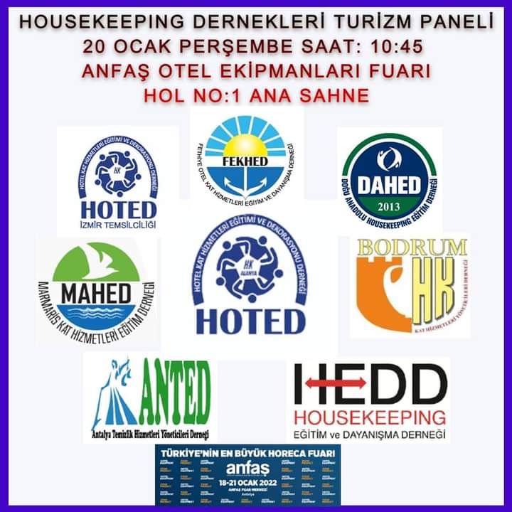 19 Ocak Çarşamba ve 20 Ocak Perşembe saat 11.00’de başlamak üzere, turizmin başlıca sorunları konulu 2 önemli panel gerçekleştireceğiz. Turizmin, sevilen, tanınmış, kendi dallarında duayen ve oldukça başarılı isimlerin katılımıyla gerçekleştireceğimiz panellerin akabinde, üyelerimizle birlikte çözüm ortaklarımızı ziyaret edip, fikir alış verişinde bulunacağız. 18 Ocak Salı, 21 Ocak Cuma günleri ise standımızda çözüm ortaklarımızı ağırlayıp, önümüzdeki sezonlar için istişarelerde bulunacağız. Siz saygı değer turizmcilerimizi, camiamızın değerli mensuplarını ve kıymetli çözüm ortaklarımızı 18-21 Ocak tarihleri arasında Anfaş Otel Ekipmanları fuarına ve standımıza davet ediyoruz.