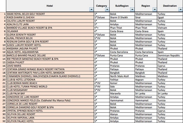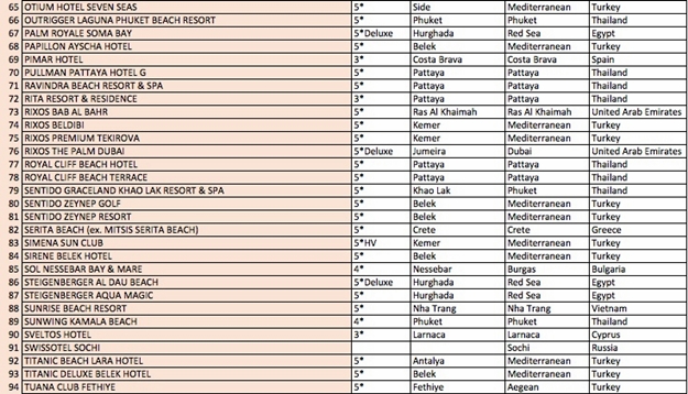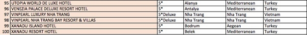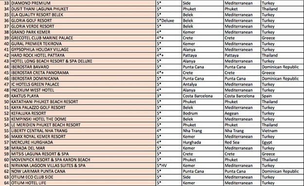 Ödül alan 100 otel arasına Alanya'dan da 4 otel girdi. Delphin Delux resort listeye 30'uncu sıradan girerek listedeki en yüksek sıralamayı alan Alanya oteli oldu. Listenin 41'inci sırasında ise Alanya'da bulunan Gypsophila Holiday Village var. Hotel Long Beach Resort & Spa Deluxe'da listeye 43'üncü sıradan girerken, İncekum West Otel 48'inci sırada yer aldı.
